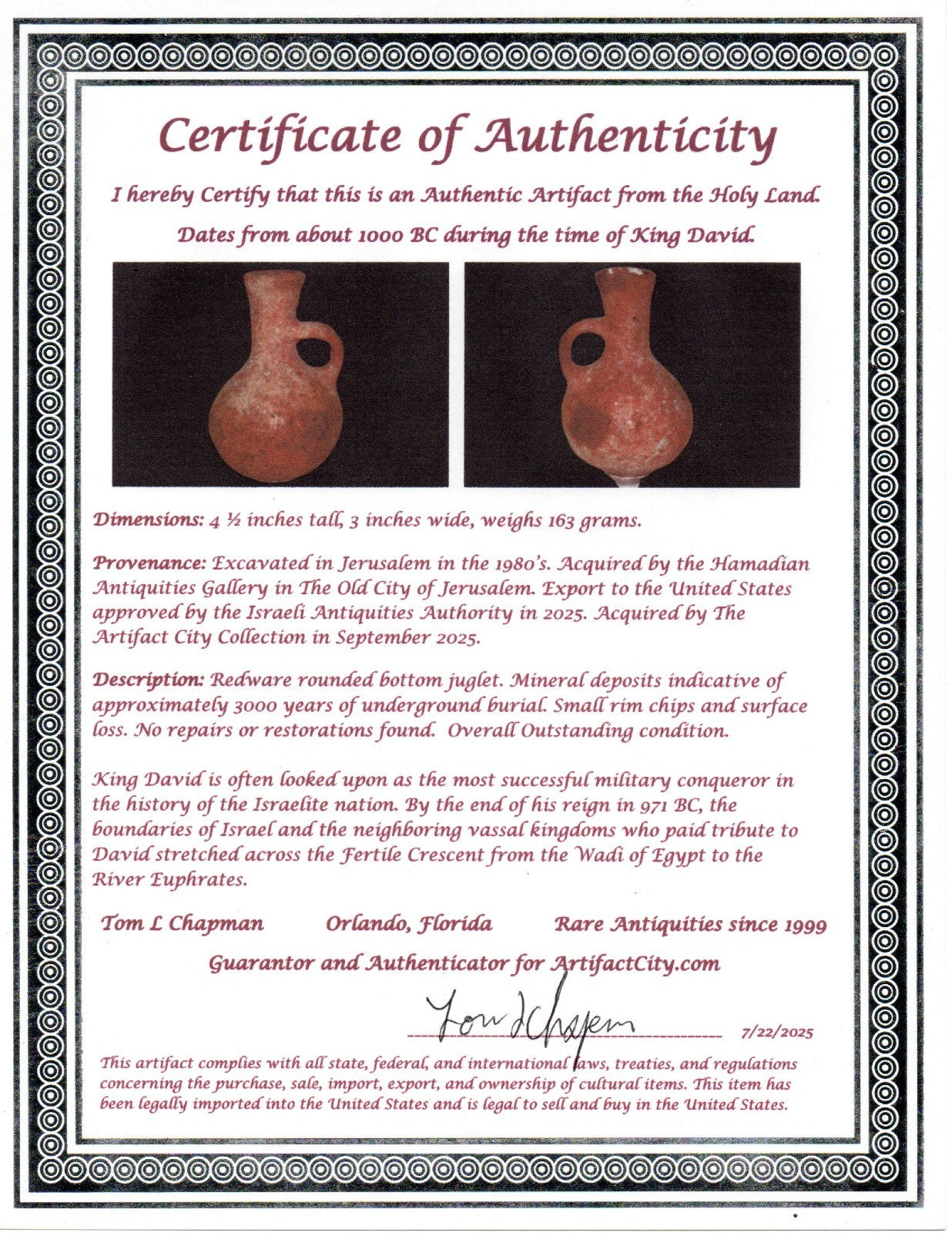 Ancient Holy Land Artifact King David Era Jug Land of Jesus Christ 1000 BC COA 9